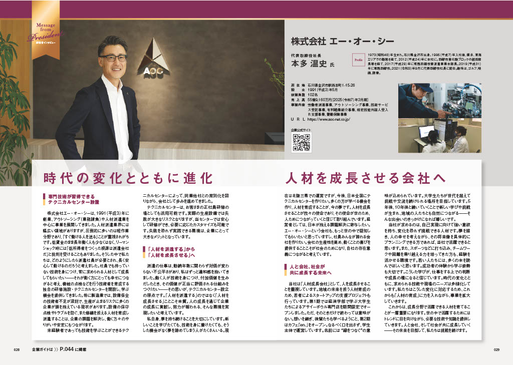 インタビュー_エー・オー・シーこのたび弊社は、東京商工リサーチが発行する優良企業情報誌「ALevel(エラベル)2027年 北陸版」に掲載されました。全国約475万社のうち、Aランク認定企業は約8%のみとされており、その中から弊社が選抜され、同誌に掲載されましたことをお知らせ致します。